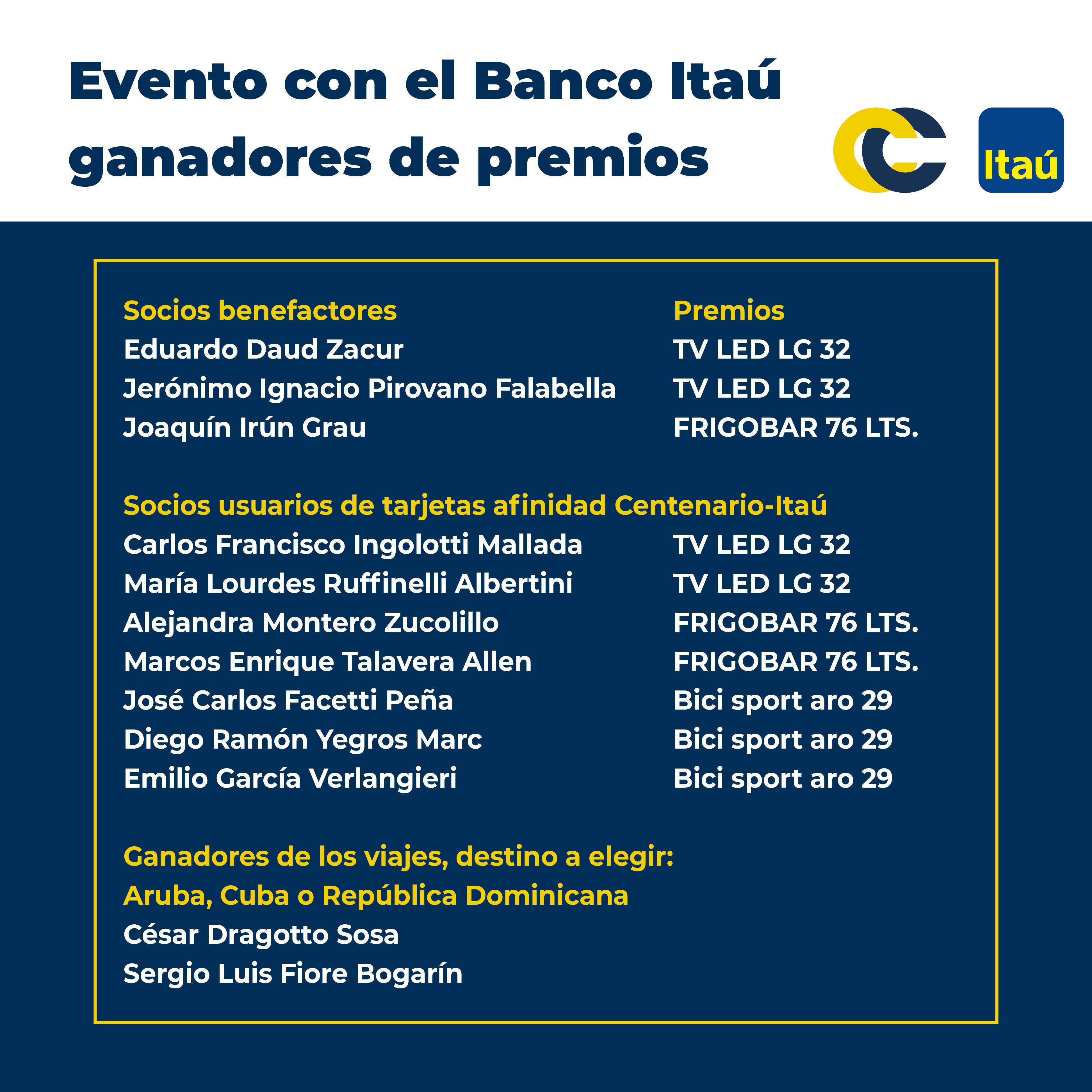 Agradeció la apertura del Banco Itaú en el fortalecimiento de las relaciones con el Club Centenario y todos los beneficios que se puedan ir dando, desde ambas partes. En nombre de la Comisión Directiva del Club Centenario agradeció la presencia de todos los ejecutivos de la firma financiera. «Felices fiestas y salud para todos», expresó el titular del Centenario.