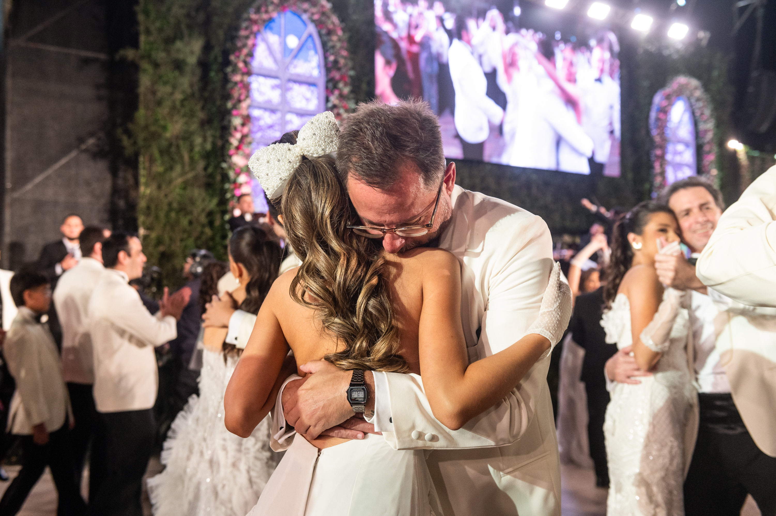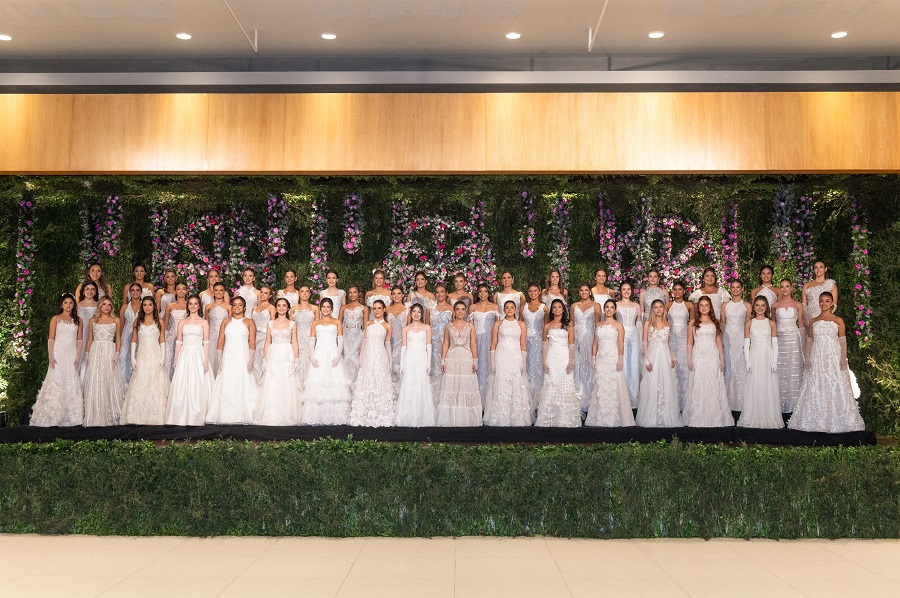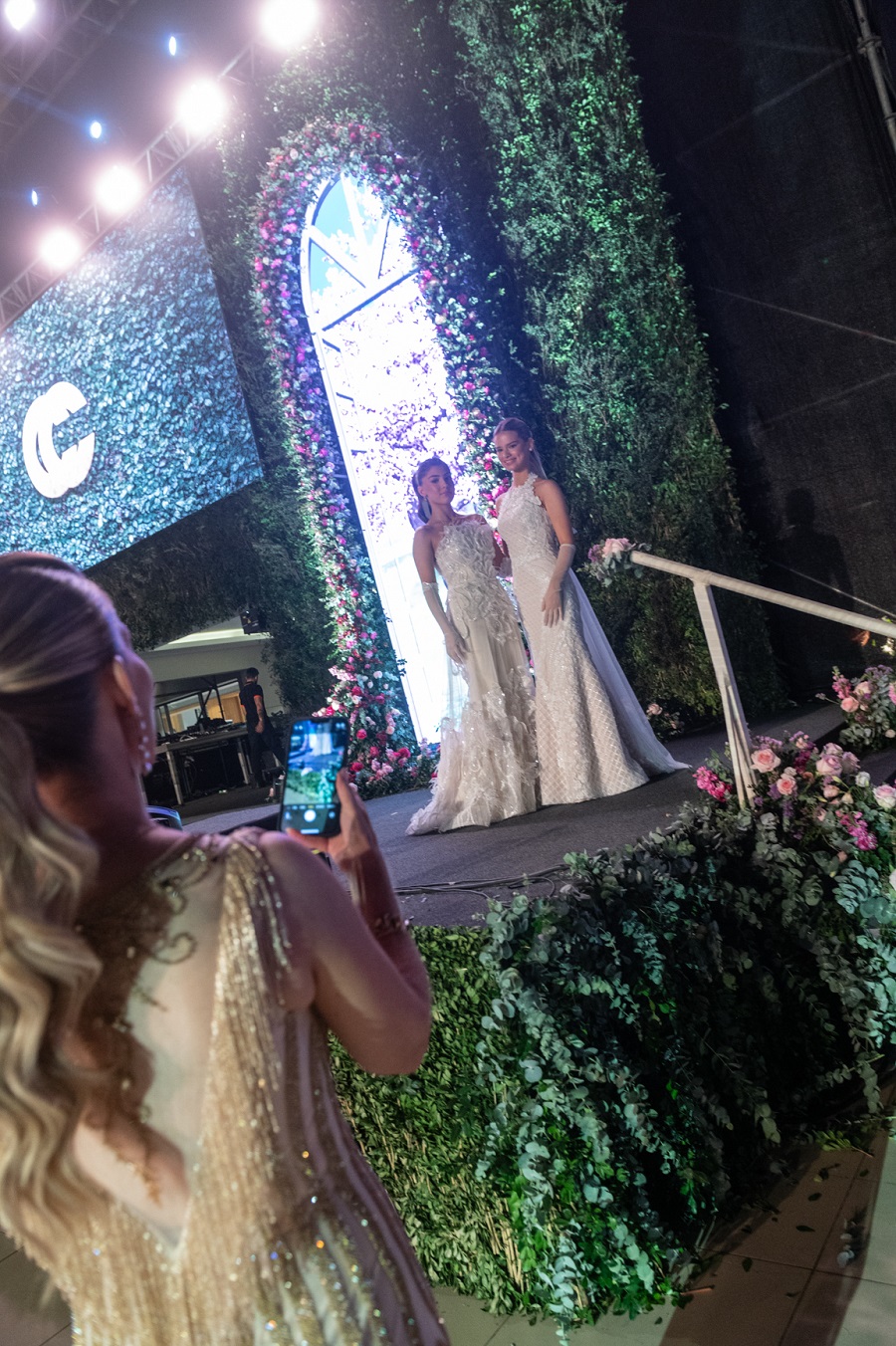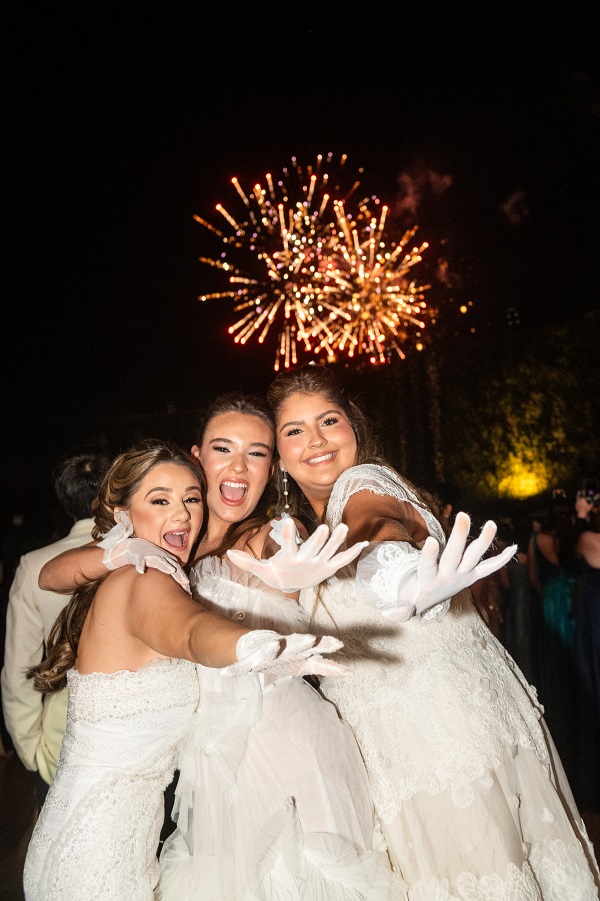 Seguidamente, las debutantes hicieron su aparición desde lo alto de la escalera y descendieron en un marco majestuoso decorado con rosas y alhelíes. La tecnología añadió un plus diferencial e innovador a la decoración, con grandes ventanales digitales que se abrían a un jardín de flores, transformando el evento en una experiencia única.