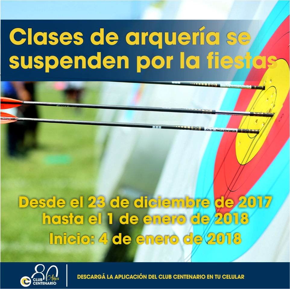 Las clases de Arquería quedan suspendidas por motivo de las actividades festivas de fin de año. Reanudando así sus actividades el Martes 2 de Enero del 2018